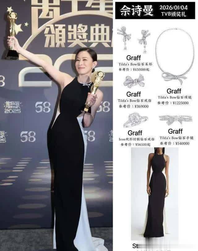 当天,佘诗曼的造型可谓惊艳全场,身上的服饰价值超过了300万,珠宝奢华至极,选用了顶级品牌GRAFF的珠宝,礼服则来自STELLAMCCARTNEY。整个人看上去既高贵又典雅,完全符合她作为女主般的气质和身份。她的造型在一众艺人中尤为突出,简直是鹤立鸡群——尤其是在一些TVB台庆的艺人穿着老旧、过时的情况下,佘诗曼的高雅和精致简直让人眼前一亮。